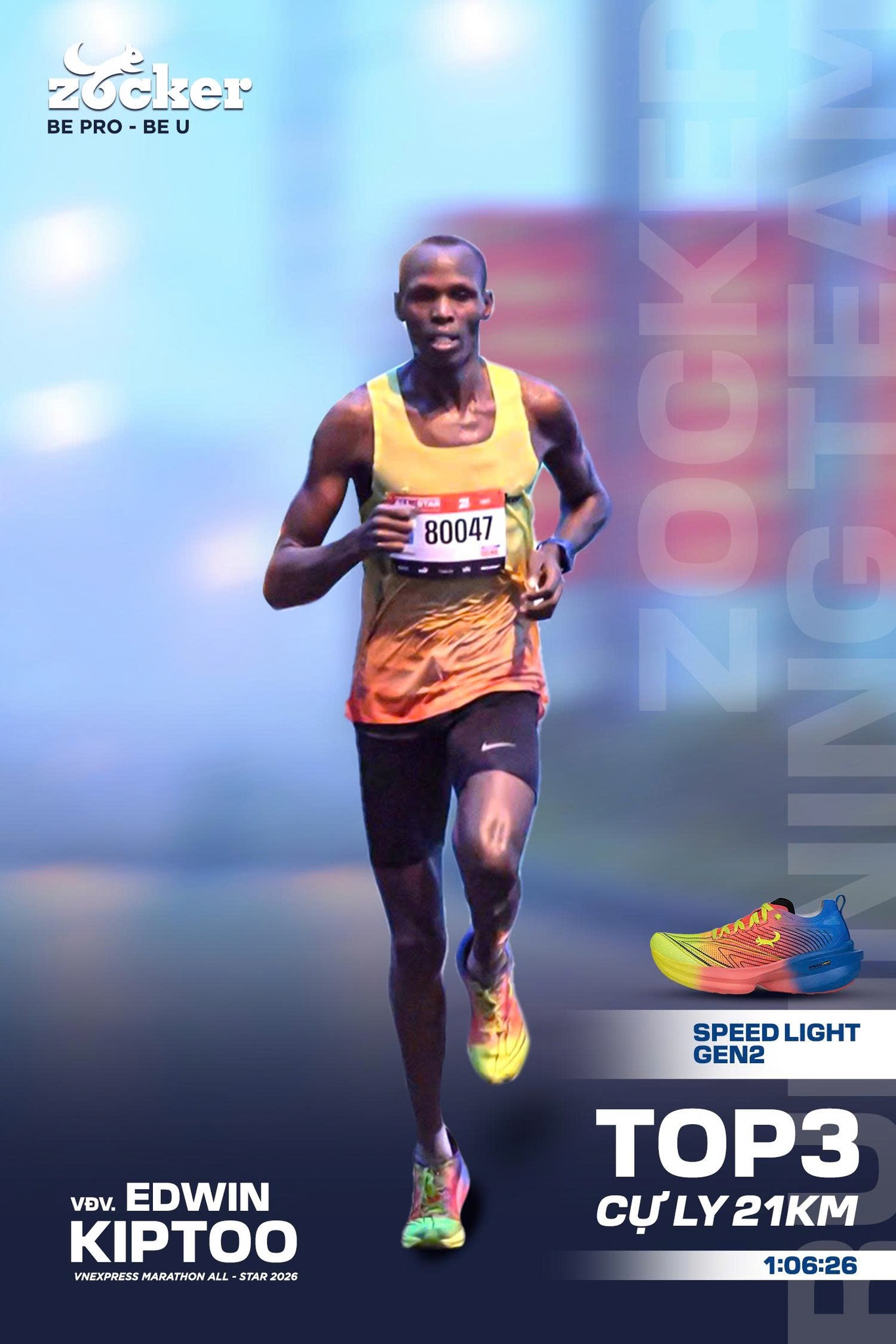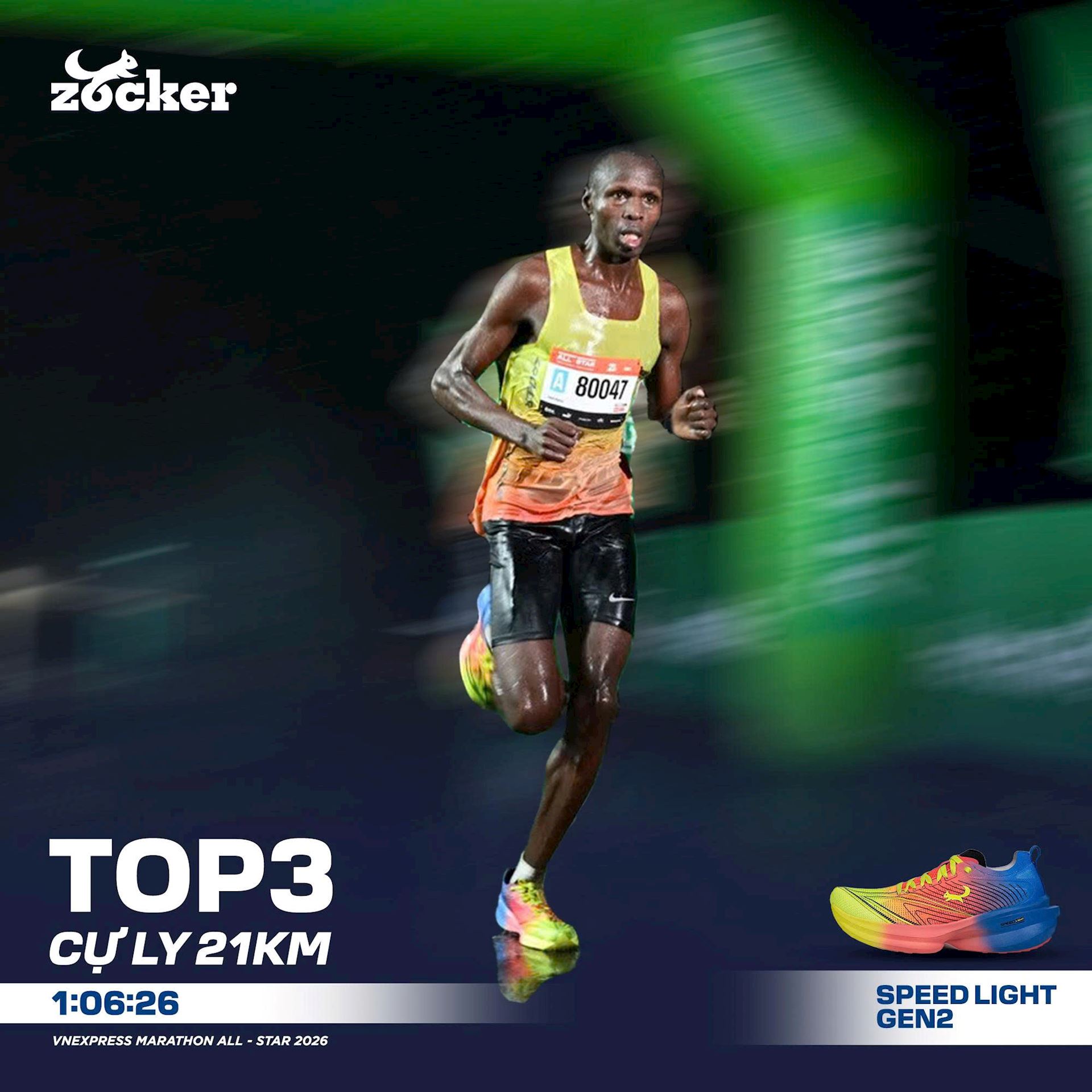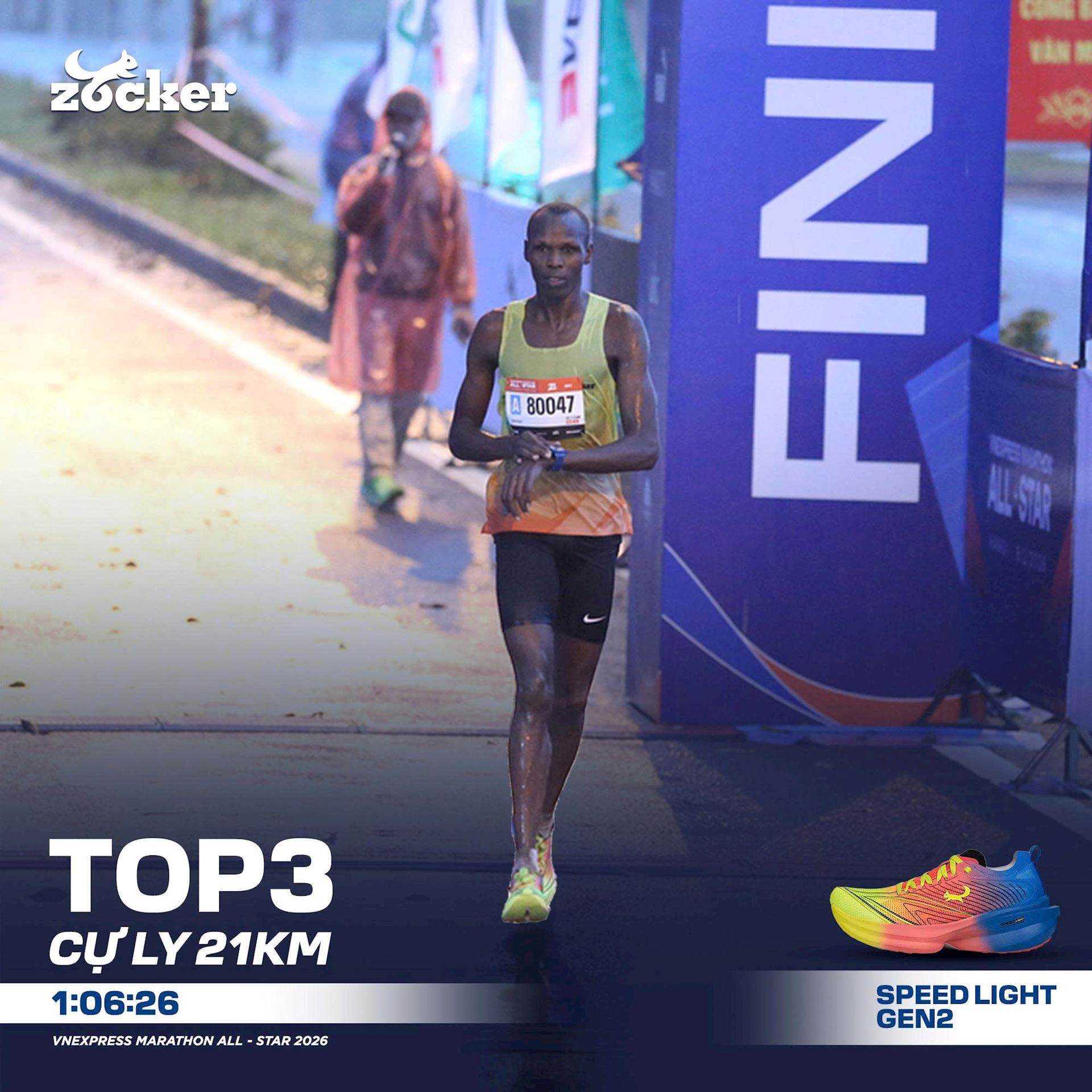 Đặc biệt, đây cũng là chặng thi đấu cuối cùng của Kiptoo trong giai đoạn đầu năm 2026. Đồng hành cùng anh trên cung đường lần này là Zocker Speed Light Gen 2 – mẫu giày thi đấu nổi bật với thiết kế tối ưu trọng lượng và hỗ trợ phản hồi lực tốt. Sự kết hợp giữa nền tảng thể lực bền bỉ, kinh nghiệm thi đấu quốc tế và trang bị phù hợp đã góp phần tạo nên màn trình diễn ấn tượng tại giải đấu năm nay.